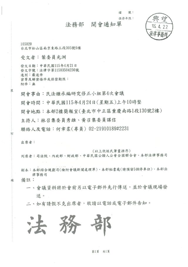 本所所長葉光洲律師,將於中華民國115年4月24日(五)上午10時00分受邀參加法務部民事繼承編研究修正小組第4次諮詢會議!